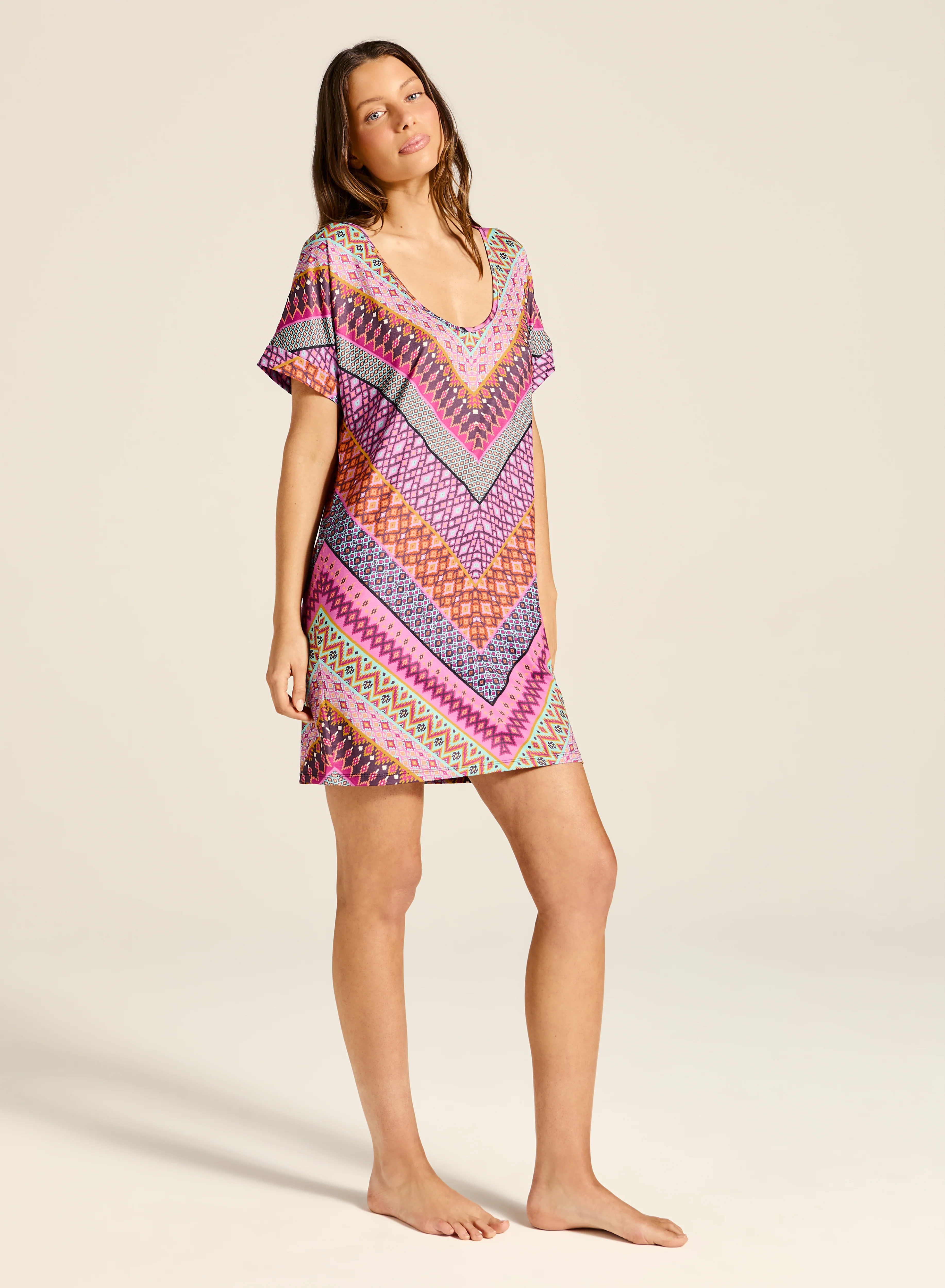 Relaxed, effortless, and full of laidback charm, this t-shirt style mumu is crafted in soft, stretchy fabric for all-day comfort. Featuring a flattering scoop neckline that can be styled off one shoulder, the mumu flows gently over the body and is finished in a playful chevron print. Perfect for sun-soaked days or layered over swim for coastal ease, it’s a versatile piece for your warm-weather wardrobe.